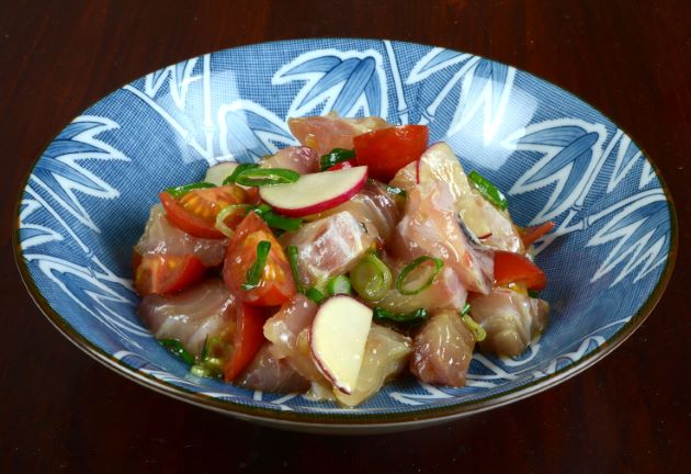 オシャレコショウダイのマリネ(ポケ、セビチェ) 刺身にしたときの尾に近い部分や、切れっ端などを余すところなく使うには、しょうゆもしくは塩に、酢、柑橘類などでマリネして食べるといい。ここでは細かく切り、ねぎ、トマト、好みの野菜などとしょうゆ、ごま油で和えたものを作る。クリックで閉じます![]()