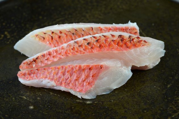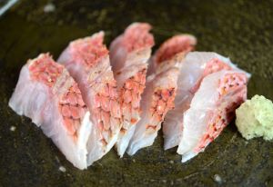 オジサンの科皮霜造り(刺身) 旬ははっきりわからないが、伊豆諸島などでは晩秋から初夏、晩秋から冬にかけて脂がのっている。初冬の固体を水洗いする。三枚に下ろし、腹骨・血合い骨を取り、皮目に湯をかけて氷水に落とす。水分をよくきり、適当に切る。皮目に独特の好ましい風味がる。しかも湯をかけることで甘味が浮き上がってくる。食感もよく非常にうまい。