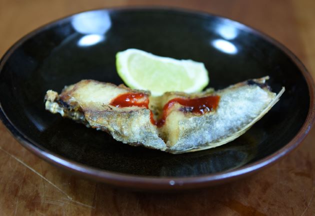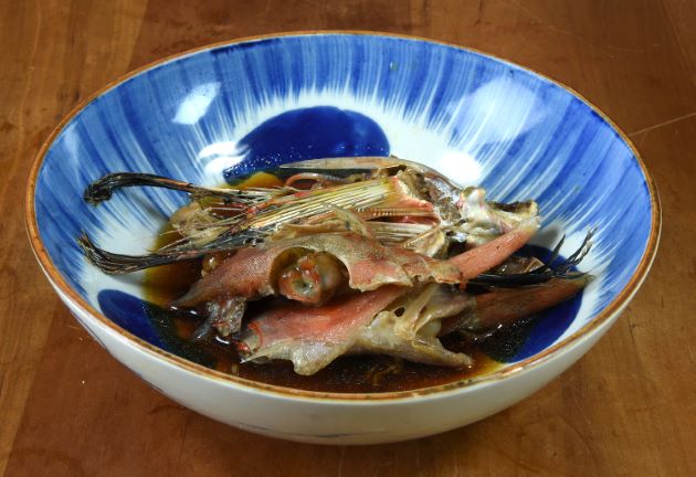 オニソコホウボウの唐揚げ 二枚に下ろして骨つきの方に片栗粉をまぶす。少し置いてじっくりと二度揚げにする。さすがに中骨は硬いが歩留まりよく食べられる。皮に香ばしさ、適度に締まった身に甘みがある。クリックで閉じます![]()
