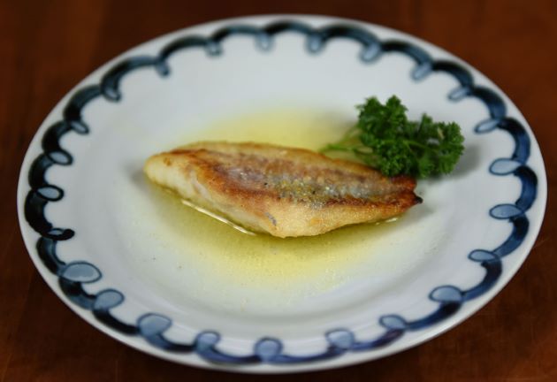 オニソコホウボウのムニエル 三枚に下ろして腹骨、血合い骨を取る。皮を引き、塩コショウして小麦粉をまぶしてじっくりソテーする。表面はこんがりと香ばしく、芯は柔らかくジューシーに出来上がる。適度に身が締まりとてもうまい。クリックで閉じます![]()