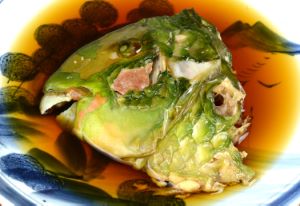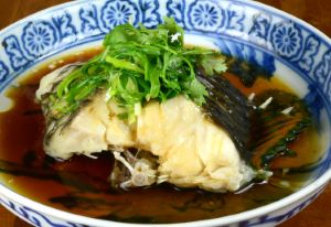 オニハゲブダイの蒸し魚(清蒸) 水洗いして二枚に下ろす。頭部に近い部分を切り身にして水分をよくきる。これを皿に盛り、蒸し器で10〜15分程度蒸す。たれ(醤油・紹興酒・魚醬・砂糖を合わせて一煮たちさせたもの。中国の甘い醤油でもいい)をかけ、香りのあるネギや香菜を乗せて煙のでるくらい熱した油をかける。柔らかくふっくらと蒸し上がり、身にうま味成分からくる甘味が感じられる。ご飯にとても合う。クリックで閉じます![]()