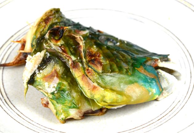 オニハゲブダイの塩焼き まさかブダイ類の塩焼きがうまいとは想像していなかった。単純に1尾を無駄なく料理するために作っただけ。水洗いして頭部を梨子割りにする。水分をよくとり、塩をする。塩を表面に揉み込むようにするといい。約半日寝かせてから焼き始める。焼き上がりの香りからしてご馳走である。皮のうまみとねっとりした食感。鶏肉のように締まった身の甘さなどなど文句なしの味だ。