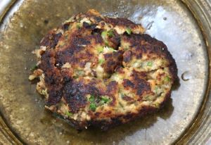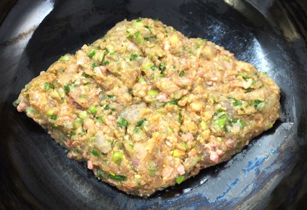 オニヒゲのさんが焼き 「なめろう」を焼いたもので千葉県では「さんが焼き」という。大葉などに挟んで焼いてもいいが、最近ではフライパンなどでソテーすることが多い。ソテーするとふんわりと仕上がり、中は非常に芳醇になる。軟らかくこくがあってとてもうまい。クリックで閉じます![]()