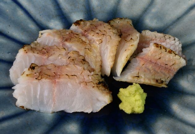 オニヒゲの焼霜造り 鮮度のいいものを使うといい。三枚に下ろして、腹骨・血合い骨を取る。皮目をあぶって氷水に落として粗熱をとる。水分を切って冷蔵庫に寝かせて皮目を落ち着かせる。これを刺身状に切る。皮自体にうま味があり、その直下に脂の存在を感じる。非常においしい。クリックで閉じます![]()