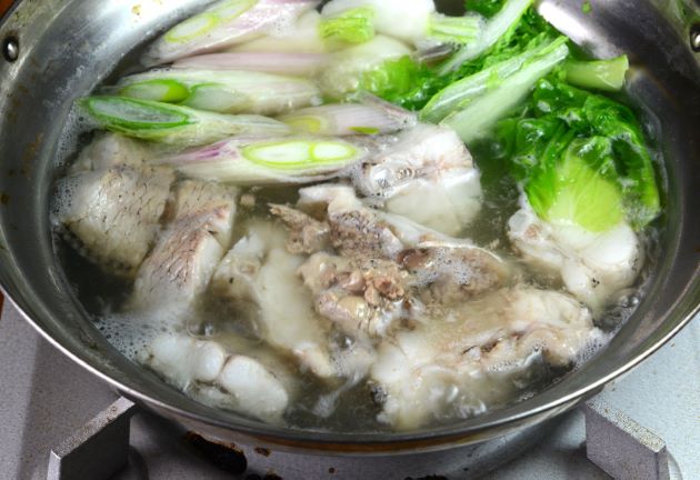 水洗いして適当に切る。肝は取り分けて置く。大型は二枚下ろしにして骨つきの方を使うといい。湯通しして冷水に落とし、残った鱗やぬめりを流す。水分をていないにとる。これを野菜とともに昆布だしに酒・塩味で煮ながら食べる。