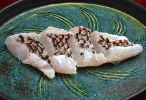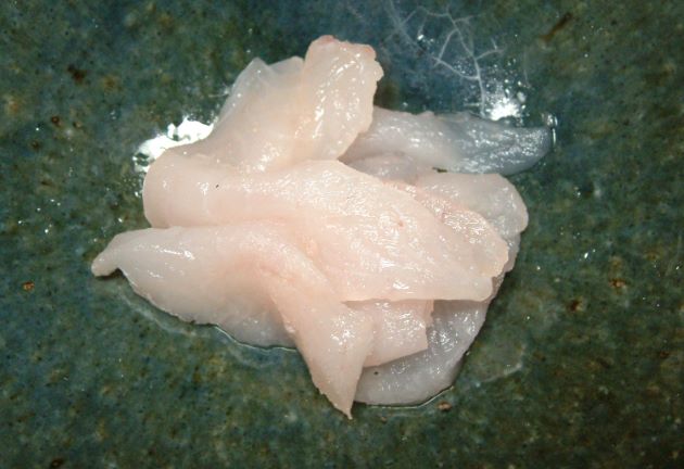 オハグロベラの皮霜造り 水分が多く、身にはあまりうま味がないので、単に刺身にしてもあまりうまくない。三枚に下ろして腹骨・血合い骨を抜く。水分をよくきり、皮目に湯をかけて、氷水に落とす。水分をよく拭き取り、刺身状に切る。クリックで閉じます![]()