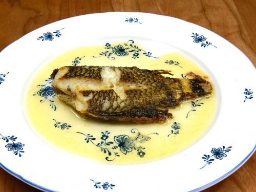 オビテンスモドキのバター焼き 水分は多いものの磯臭さなどは感じられない。白身としては上質である。水洗いして頭部は下咽頭骨が煩わしいので切り取る。これに塩コショウして少し置き、じっくりと多めの油でソテーする。仕上げにマーガリン(バター)で風味づけする。淡泊で嫌みのない味がバターではえる。とても味がいい。