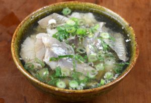 カイワリのみそ汁 沖縄の「がーらのいお汁」にあたる。頭部などあらをいちど湯通しし、冷水に取り鱗や血液などを洗い流す。水をよく切り、水(昆布だしでも)から煮だしてみそを溶く。実にうま味豊かな汁になる。ご飯にも合う。クリックで閉じますカイワリのみそ汁