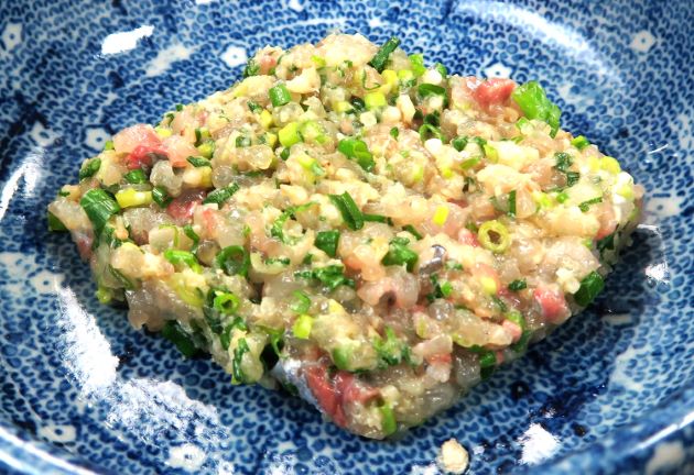 カイワリのみそたたき(なめろう) 三枚に下ろして腹骨を取り、皮を剥ぎ取る。これを細かく切り、香辛野菜(ねぎ、玉ねぎ、青じそ、みょうが、しょうがなど)とみそを加え切れる包丁でたたいたもの。これを焼くと「さんが焼き」になる。クリックで閉じます![]()
