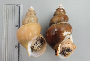 14cm SL 前後になる。縫合は浅く殻質はやや硬い。膨らみはエッチュウバイと比べると弱く、ややのっぽだ、くびれも深くない。殻表は布目状で赤みのある褐色のはがれにくい殻皮をかぶる。[13cm SL 新潟県糸魚川市親不知 バイカゴ/水深約400~500m]