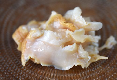 カガバイの刺身 食感はエゾボラ属と比べると劣るが、その分柔らかい。貝らしい風味があり、甘味が豊か、美味である。