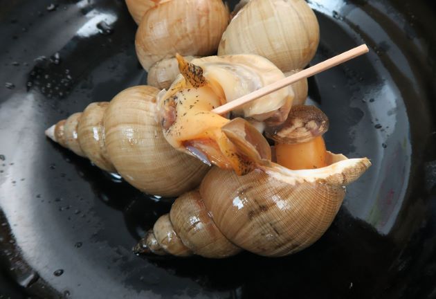 エゾバイ属のなかで比較的貝殻の柔らかい部類なので、身を取り出すときは貝殻を割る。内臓を取り除き足を割り、唾液腺をとる。初めに何もつけずヌメリをもみ出す。ある程度ヌメリが出て来たら一度洗い、今度は塩を加えてもむ。ヌメリがなくなってきたらていねいに洗い、水分をよくきり薄く切り放す