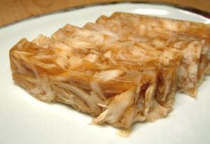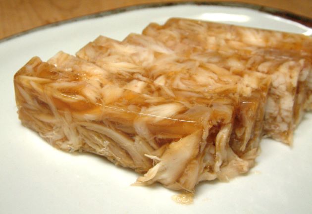 カスザメの煮こごり」 体幹部分を皮付きのまま適当に切り、軽くゆでる。冷水に落として皮をこそげ落ちして水分を切る。酒・みりん・醤油・多めの水で煮る。鍋止めして身と煮汁にわける。骨を取り除き、身をほぐして煮汁に戻し、型に入れて冷やす。ゼラチン質が多いので見事に煮凝る。うま味豊かで食べ飽きない。クリックで閉じます![]()