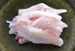 カスザメの洗い 鰭の部分を使う。面倒だが皮を剥き、縦方向にできるだけ薄く切る。生きている、もしくは活け締めはこのまま氷水にさらす。少し時間がたったものは手を入れられない位の湯に通して氷水にいれてさらす。水分をよくきり酢みそ、酢醤油などで食べる。あっさりした中に軟骨のこりこりした食感が心地よい。夏向きの料理である。クリックで閉じます![]()