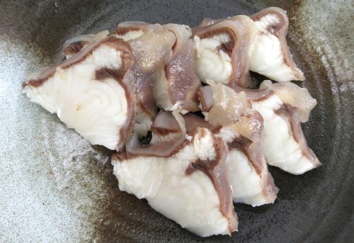 カスザメの湯引き 今回は尾の部分を使った。鰭などどこでもいいと思う。西日本のフカの湯引きの定番魚でもある。クリックで閉じます![]()