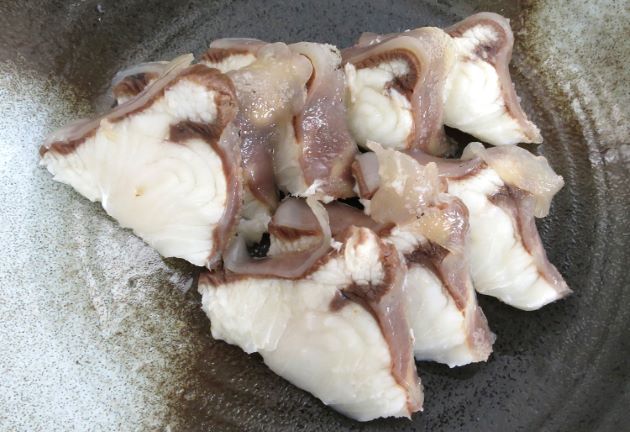 尾や鰭は適当な大きさに切り取る。熱湯の中につけて表面の皮がこそげ取れるようになったら冷水に落とす。冷水の中で皮をこそげとる。水分をよく切り、刺身状に切る。これをもう一度湯がく。水分をきって酢みそなどで食べる。