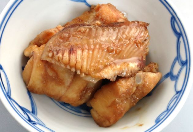 カスザメの煮つけ 煮つけも定番料理である。ドチザメ科と違ってゼラチン質に富むので、煮ても硬く締まらない。皮付きのまま適当に切り、ゆでる。表面の皮が取れるようなったら、冷水に落として皮をこそげ取る。食べやすい大きさに切り、湯通しして冷水に落として霜降りに。水分をきって酒・みりん・醤油・水を沸かした中で煮る。くせのない味わいで軟骨周りがとても味わい深い。見事な煮凝りができる。クリックで閉じます![]()
