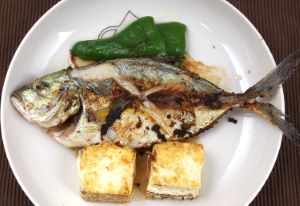 カスミアジのバター焼き 小型を丸のまま使った。水洗いして尾頭付きのまま塩コショウ。自宅ならば頭部、鰭などとって料理した方がやりやすい。これを多めの油でソテー。香ばしく火が通ったらマーガリン(バター)で風味づけする。しょうゆをたらすとご飯にあう。
