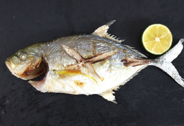 カスミアジの塩焼き 小型なら1尾丸ごとでもいい。ここでは大型なので切り身にした。塩を振り1時間以上置く。これをじっくりと焼き上げる。アジ科特有の風味があり、しかも上品な後味、とてもおいしい。