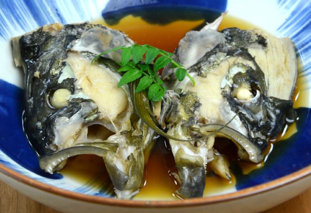 カスミアジの煮つけ 大型の兜を煮た。小さいものは丸ごと使うといい。湯通しして冷水に落として残った鱗とぬめりを流す。水分をよくきり酒・醤油・水、臭い消しにショウガで煮る。みりん、砂糖で甘味をつけるとご飯に合う。身離れがよく身に呈味成分からクル甘味がある。