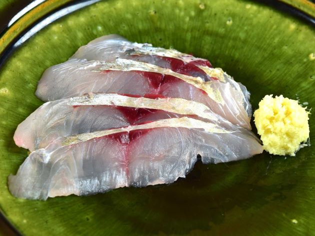 カスミアジの刺身 水揚げ時の扱い、流通上の扱いが味に大きく影響する。できれば活け締めがいい。アジ科ではあるが、マダイなどに近い風味がある。白身に背の青い魚のうまさを加味したというとわかりやすいかも。水洗いして三枚に下ろして皮を引き、刺身にする。しょうがもいいがわさびも合う。