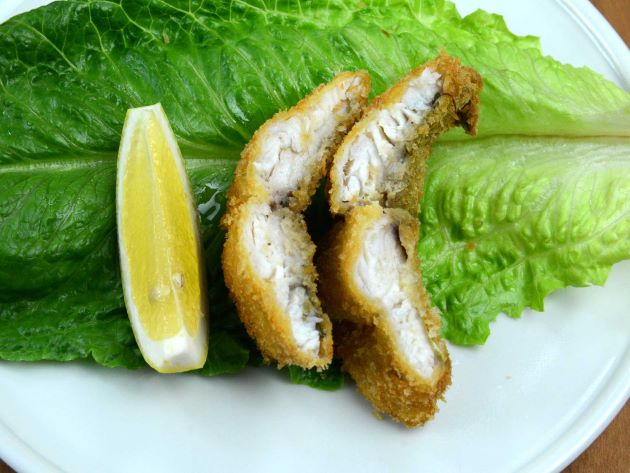 カスミアジのフライ 水洗いして三枚に下ろして腹骨と血合い骨を取る。小型は半身で大型は切り身にする。塩コショウして小麦粉をまぶし、衣(卵・小麦粉・水)をからめてパン粉をつけて揚げる。やや高温でからりと揚げるといい。マアジのフライと比べるとたんぱくな味わいだが、ある意味クセがなく上品。