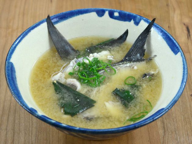 カスミアジのみそ汁 アジ科の魚のみそ汁は絶品である。大型ならあらを小型なら丸ごと使ってもいい。水洗いして湯通しして冷水に落とす。水分をよくきり、水から煮出してみそをとく。非常にこくのある味わい深いだしがでる。身・皮も美味でとてもおいしい。