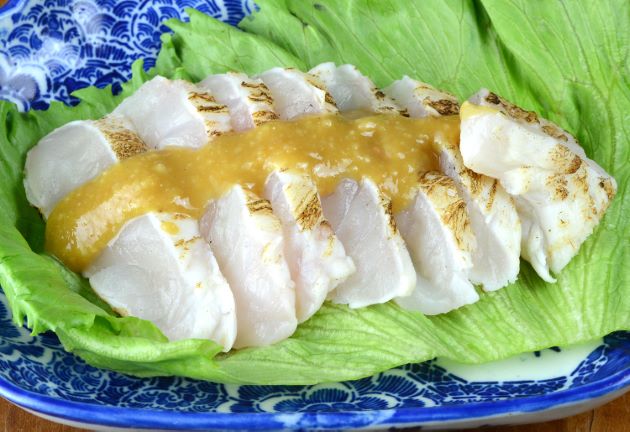 カナフグの焼霜造り(あぶり) 炙った表面の香りがいい。完全な生よりも身自体のうま味も増しているようである。酢みそとの相性がいい。クリックで閉じます![]()