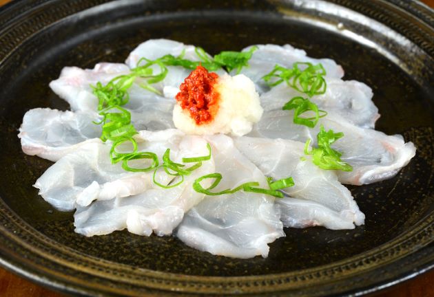 カナフグの刺身 活け締めにしたものは、刺身に引くとしっかり硬く、噛めばうま味がにじみ出てくる。非常に大型なので1枚の刺身が大きいのも魅力的である。クリックで閉じます![]()