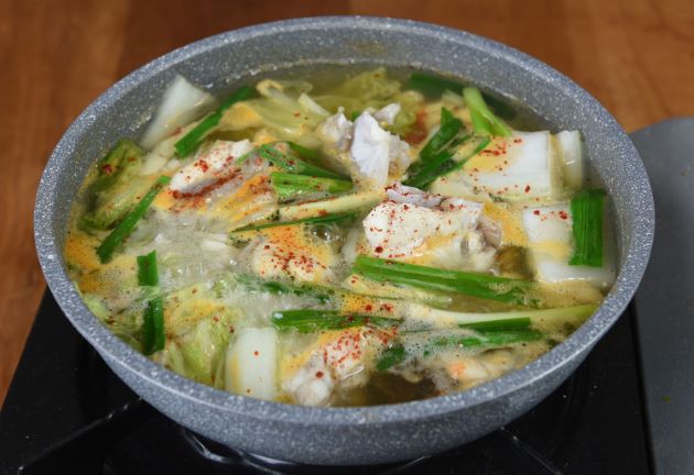 カナフグの鍋(韓国風) 昆布だしで酒・塩の汁で煮ながら食べる「ちり」もおいしいが、ここでは煮干しだしを使った。味つけは酒・塩。野菜と一緒に煮ながら食べる。唐辛子の辛さが食用をそそり、ご飯と一緒に食べてもうまい。カナフグなどは安いものなので、あまり上等な料理よりも普段の料理法が合う。