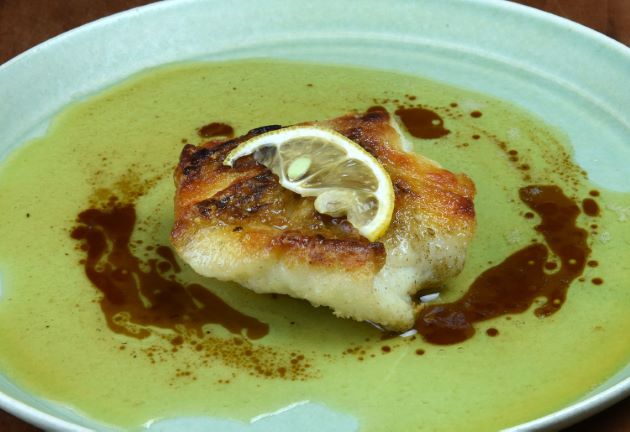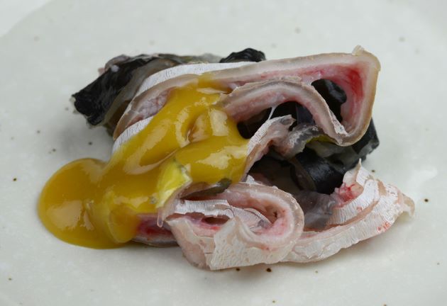 水洗いして皮を剥き、三枚に下ろす。腹骨・血合い骨を取り、薄皮をバーナーであぶって氷水に落とし粗熱を取る。水分をよくきり、刺身状に切る。今回は辛子酢みそをそえた。