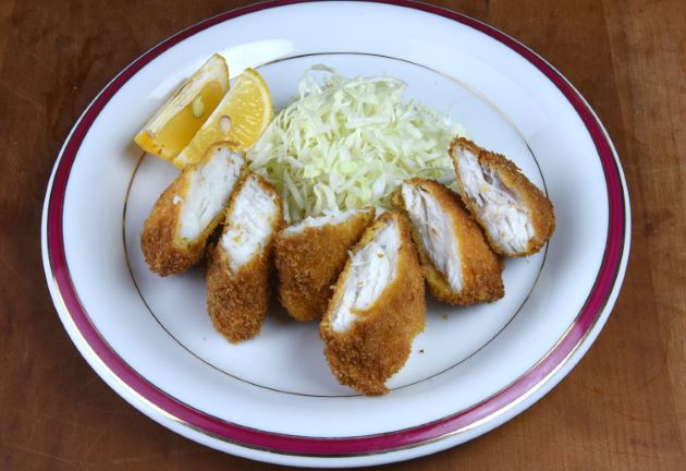 カナフグのフライ 刺身などにすると水っぽいが、揚げるとそれが利点となる。切身に塩コショウして、小麦粉をまぶし、衣(水・小麦粉・卵)をからめ、パン粉をつけてからりと揚げる。さくさくとした中に、鶏のささみを思わせるように柔らかな身でとてもおいしい。クリックで閉じます![]()