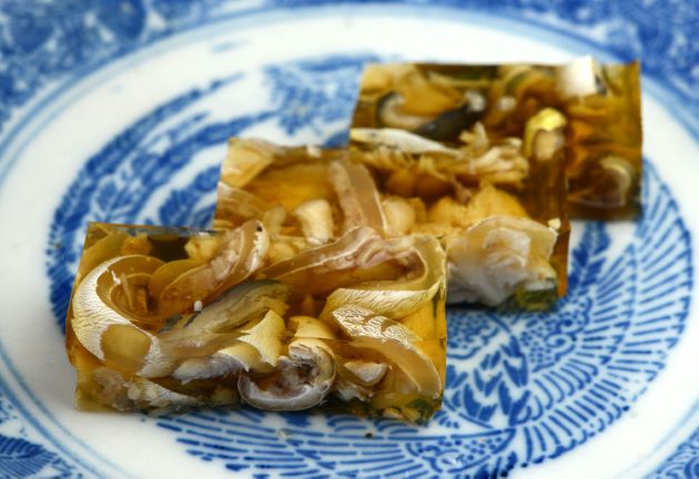 カナフグの煮凝り 固まった煮汁の中で皮が強い食感を感じさせる。噛むほどにうま味がにじみ出てくる。ご飯に乗せるとやたらにおいしい。クリックで閉じます![]()