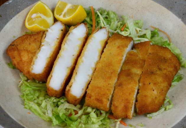 カミナリイカのフライ(イカカツ) 大型で外套膜(胴)の部分に厚みがある。これを揚げると大振りのトンカツのような形になる。クリックで閉じます![]()
