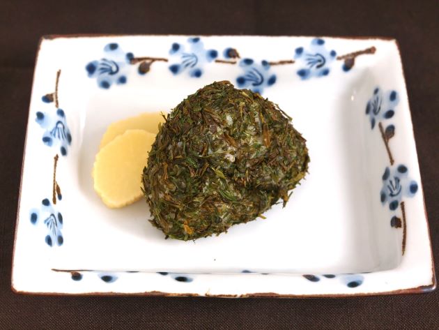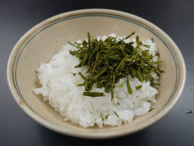 お握り(なのりお握り)/乾製品 カヤモノリの乾製品(ここでは愛知県産なのりを使用)をあぶって細かくほぐす。これを塩握りにまぶしつけたもの。ご飯に混ぜ込んでお握りにしてもおいしい。ご飯は炊きたてか、レンジで温めてから。温かいご飯の方が香りが立つ。クリックで閉じます![]()