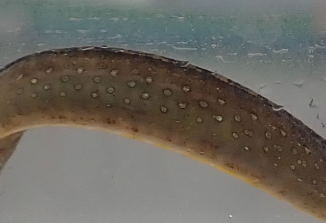 SL 18cm前後になる。体に縁取りのある丸い斑紋が散らばる。腹部の中央隆起はよく発達する。吻の中央隆起はまっすぐ。