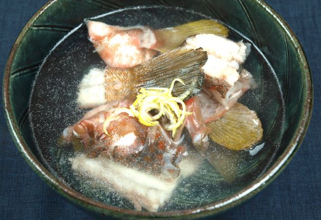 キジハタの潮汁 あらを湯通しし、冷水に落として鱗などをこそげ落とす。よく水を切り、昆布だしで煮だして酒、塩で味つけする。上品でいながらうま味豊かな汁で。あらについた皮、身も実にうまい。柑橘類を搾りながら食べると、より味わい深くなる。