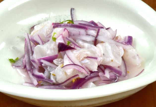 キジハタのセビチェ ペルーの魚介類のマリネである。刺身などを作ったときの中途半端な身を集めて置く。細かく切り、青唐辛子・塩・紫玉ねぎ・ライムで締める。1時間以上たったら食べられる。非常に辛味が強く塩辛いが独特のおいしさがある。スピリッツにとても合う。