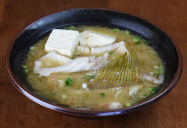 キジハタの魚汁(みそ汁) 大型はあらを、小振りなものは丸ごと使うといい。水洗いして適宜に切る。湯通しして冷水に落とし、残った鱗やぬめりを流す。水分をよくきり、水から煮出してみそをとく。単純な料理ながら実にうま味豊かな味わいが楽しめ、また皮や身がとてもおいしい。ご飯のおかずにもなる。