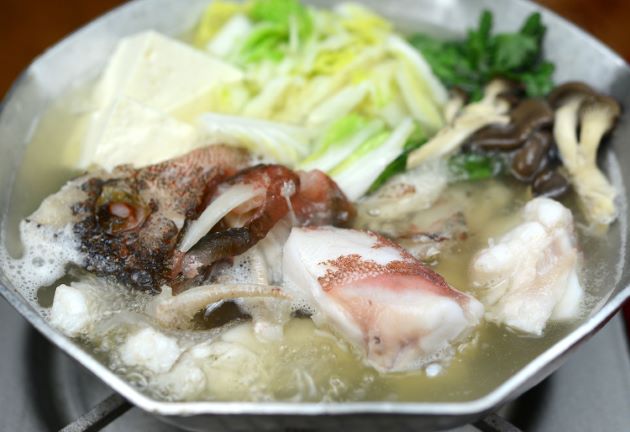 キジハタのちり(水炊き) 上品な白身の味が堪能出来る。軽く煮ただけでは硬い。この煮え加減をみながら食べるというのがいい。皮のねばっこさ、甘味と身のほぐれ感など舌が喜ぶ要素がいっぱいある。