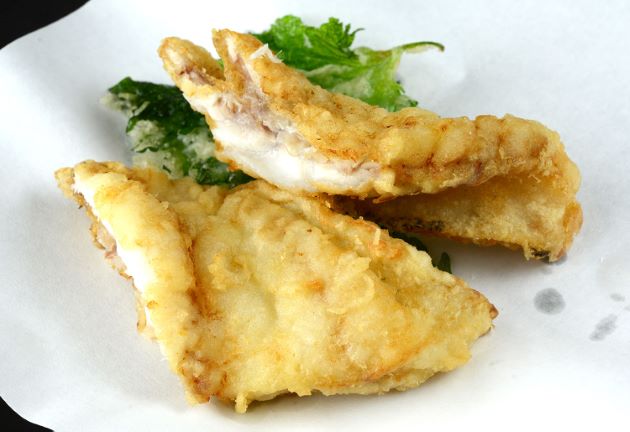 尾に近い部分を切り身にして厚みを半分に開く。軽く振り塩をして少し置き、出て来た水分を取り小麦粉をまぶして衣をつけて高温で揚げる。