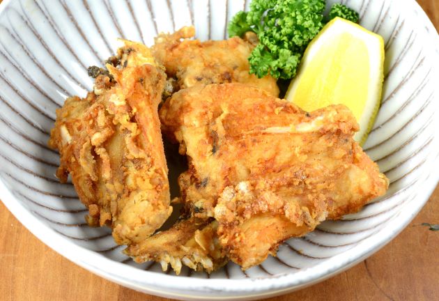 キジハタの唐揚げ ハタ類の唐揚げの食感は鶏肉に似ている。繊維質が強く適度に締まる。豊かなうま味があり、後味が甘い。