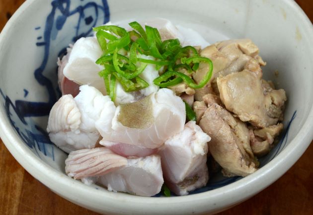 キビレカワハギの湯引き 水洗いして皮を剥ぐ。三枚に下ろして薄皮がついたまま湯通しする。氷水に落として適当に切る。同様に肝も塩ゆでして氷水に取り、水分をよく切っておく。これを合わせて旬の青唐辛子で食べる。ポン酢でもいいし、わさび醤油でもおいしい。クリックで閉じます![]()
