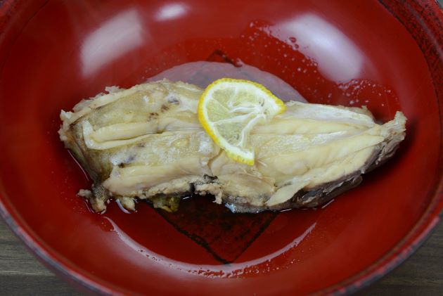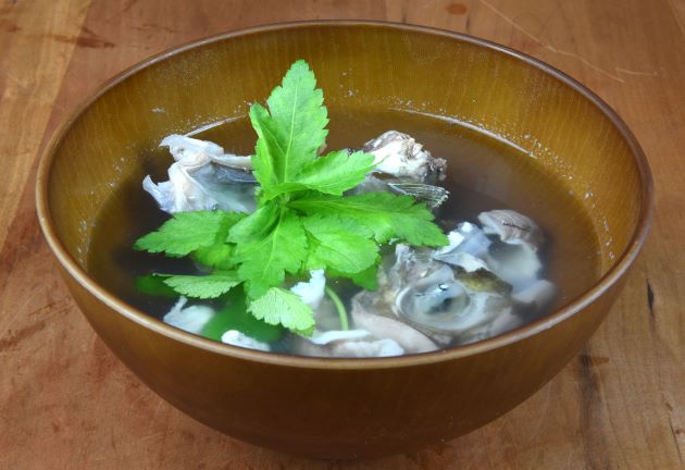 キビレカワハギの潮汁 あら、肝などを集めて置く。湯通しして冷水に落として霜降りにする。水分をよくきり、昆布だしで煮だし、酒・塩で味つけする。うま味豊かな汁になり、骨についた身も甘味があって美味。クリックで閉じます![]()
