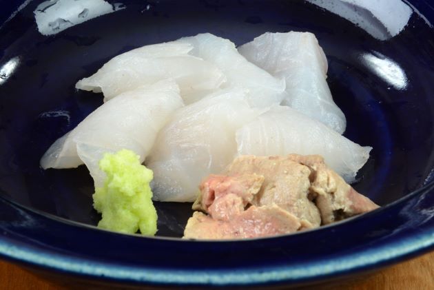 水洗いして薄皮を引き、普通に刺身に切る。肝は湯通しして冷水に取り、水分をよくきる。肝の味わいはウマヅラハギと変わらない。ほんのりと甘味があり、食感もいい。