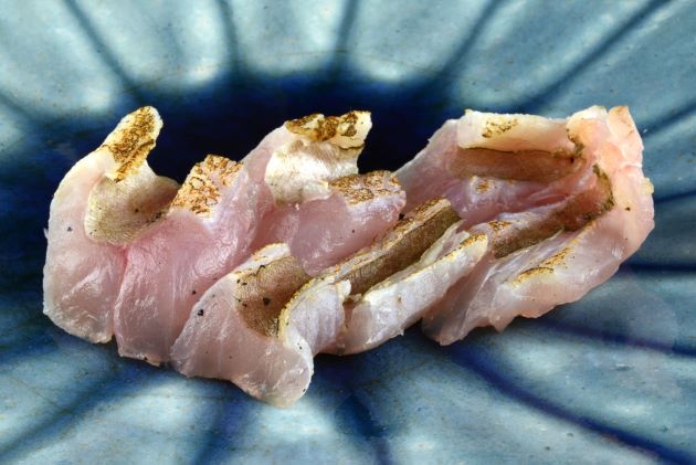 キビレカワハギの焼霜造り カワハギ類はやや単調な味わいなので、薄皮を生かしてみた。外側の皮を剥ぎ、三枚に下ろし腹骨などを取り去る。薄皮をあぶって切りつけた。薄皮下に味があり、皮目の香ばしさとともにとても味わい深くなる。クリックで閉じます![]()
