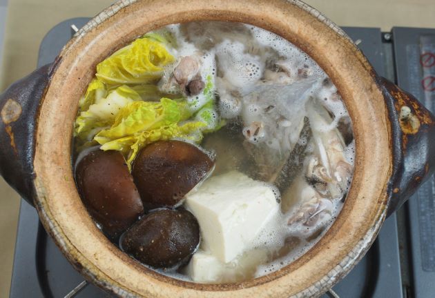 キビレカワハギの鍋 あらなどを集めて置く。湯通しして冷水に落として霜降りにしておく。水分をよくきり、昆布だしに酒・塩味の汁で煮ながら食べる。うま味豊かなだしが出て、あらなどに付着した身がとても味わい深い。いい鍋材料だと思う。クリックで閉じます![]()