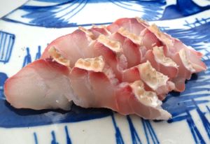 キビレフエダイの刺身 1尾だけしか食べていないので、血合いの濃さが種の特徴なのかは不明。血合いが濃く、身は比較的柔らかく透明感に乏しかった。三枚に下ろして背の部分を刺身にしたもの。味は非常によく、刺身としては上の部類である。