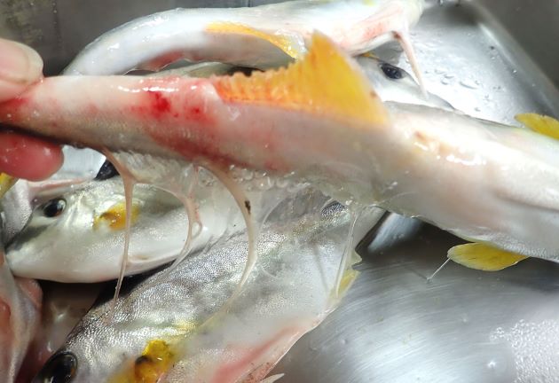 血合いがすぐにくすむので、鮮度のいい内に水洗いして粘液を流し、皮を剥く。三枚に下ろして、血合い骨、腹骨を取り、そぎ造りにする。