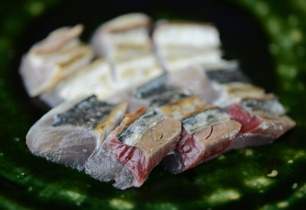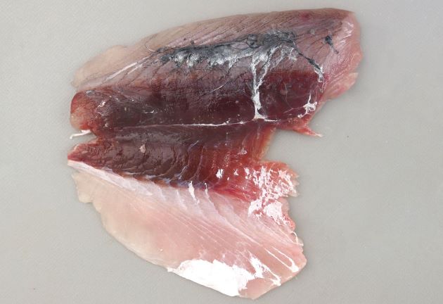 ギンカガミの焼霜造り(焼き切り) 普通に刺身にすると血合いの色合いが悪く、また変色しやすい。皮が弱いので、三枚に下ろして腹骨・血合い骨をとり、皮目をあぶって切りつけてみた。皮の香りがよく、血合いの酸味、身の甘さが感じられて非常に美味。